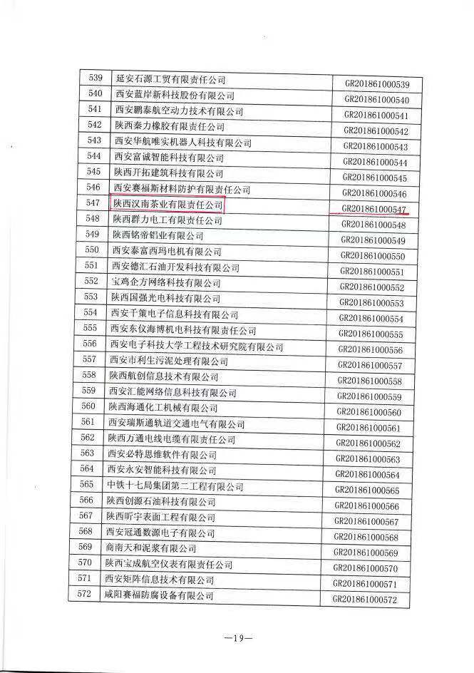 2018年,陕西省汉南茶业有限责任公司顺利通过陕西省科学技术厅、陕西省财政厅、国家税务总局陕西省税务局的联名评定批准,被认定为"国家高新技术企业",并已获得《高新技术企业证书》,成为西乡县茶叶行业首家获此殊荣的企业。这是对汉南茶业坚持走科技创新、助推茶产业转型升级路线的认可和肯定。