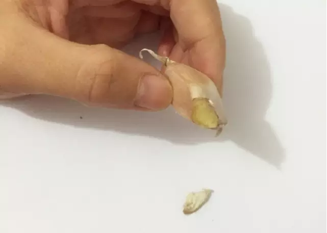 第二刀从蒜瓣中间切开皮