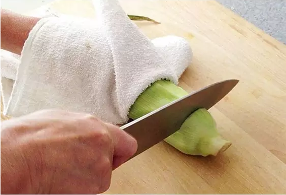 把玉米洗净后用刀切掉底端