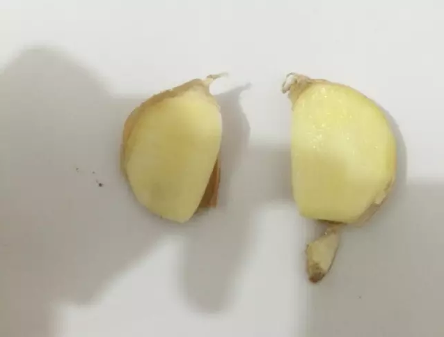 第二刀从蒜瓣中间切开皮